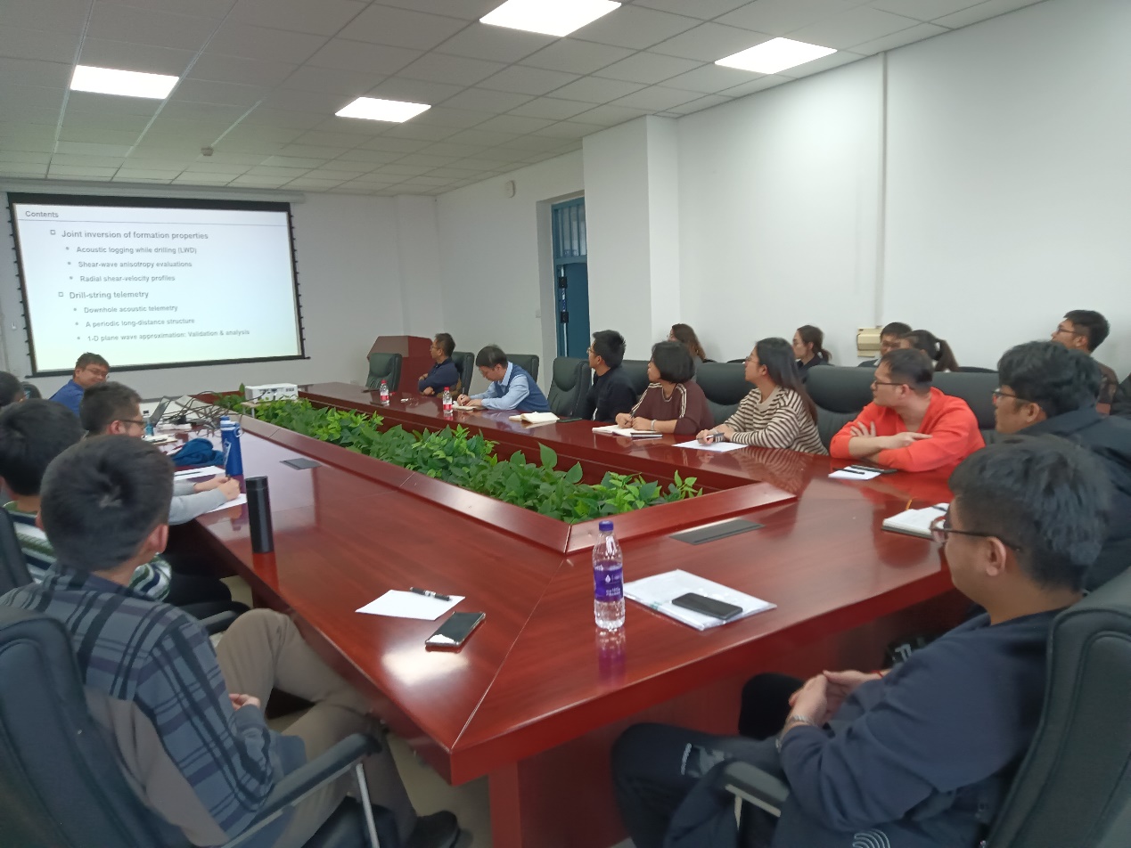 何晓研究员介绍了随钻声波测井在深地探测中的重要意义,讲解了利用随钻井孔多阶声导波反演地层纵波和横波速度的技术路径,以及利用钻柱导波提高钻探信号传输速度的声学思想。反演地层纵横波速度和利用钻柱声导波通信,为钻进轨道控制和实时探测提供了有效方案。力学系师生就井孔声导波技术和声场高效计算方法与何晓研究员进行了深入交流讨论。何晓还介绍中国科公司声学研究所超声研究室的学科布局和研究方向。