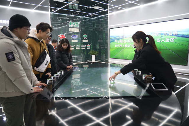 三维投影、数字人讲解、实时数字展示……前沿技术与新颖形式助力同学们深入了解北大荒集团“三大一航母”发展蓝图和双控一服务、一体两翼、三库一中心、绿色智慧厨房“1213”集团高质量发展工程体系的责任使命;九三、完达山、丰源……日常所用的米面粮油、生活点滴摆满展台,充分展示了北大荒集团构建的“从田间到餐桌”全产业链绿色有机食品供应渠道。近距离观摩农业成果与粮食生产数据,实践团对农业这一产学研用结合处、学科交叉增长点有了更深刻的认识,端稳“中国饭碗”的底气与自豪感油然而生。